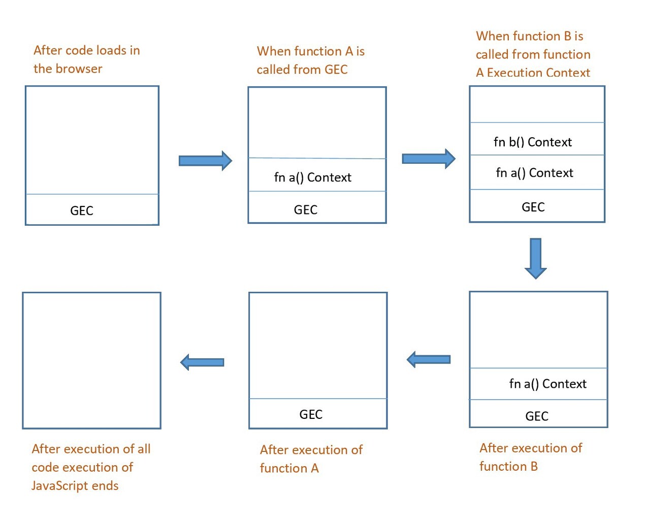 위와 같은 그림은 함수 호출로 인해 실행 컨텍스트 스택에 각 실행 컨텍스트가 쌓이는 모습을 나타낸 것이다.
