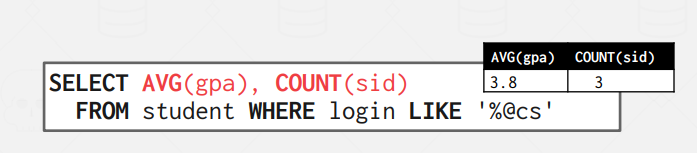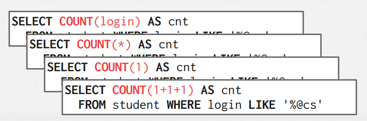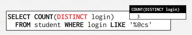 DISTINCT 키워드를 COUNT, SUM, AVG 등의 Aggregates와 함께 사용할 수 있는데, 이 경우 중복된 값을 제외하고 연산을 진행한다. 즉, Set 기반으로 작동하는 것처럼 변경할 수 있다.