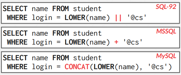 ||의 경우 SQL standard 문법이며, MSSQL와 MySQL의 경우 아래와 같이 사용한다.