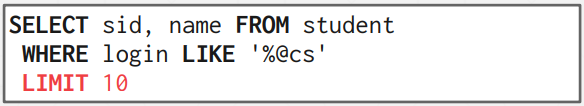 위 예시는 조건을 만족하는 record에서 sid, name column만을 뽑아 10개의 record를 리턴한다.