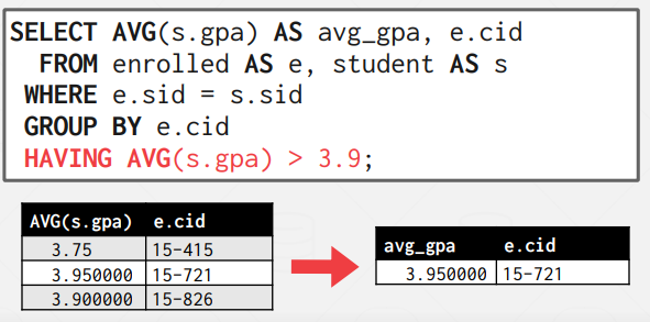 avg_gpa의 경우 부분집합에 대한 연산이 끝난 후 생기는 column이기 때문에 WHERE 절로 조건하는 순간에는 존재하지 않고, 따라서 에러를 발생시킨다.