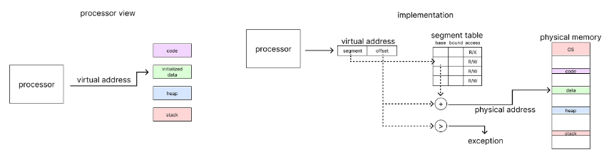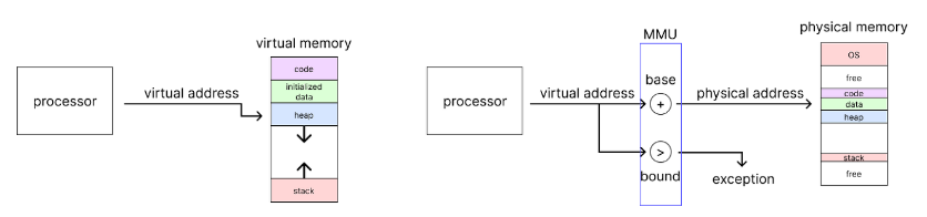 단순히 base 값을 Virtual Memory에 더해서 Physical memory로 변환하는 과정으로, bound 체크를 통해 변한된 메모리가 해당 범위를 벗어날 경우 exception을 발생시킨다.