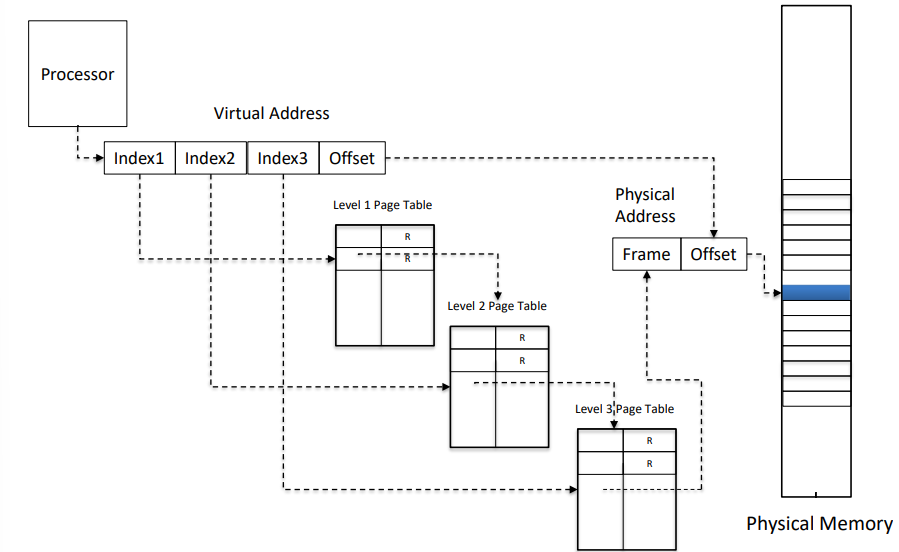 각 테이블에서 어떤 엔트리를 고를 것인지는 virtual address에서 잘라낸 index1, index2, index3의 값을 사용하게된다.