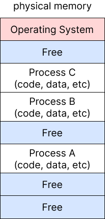 이는 곧 physical memory에서 code-data-heap-stack이 연속으로 존재해야 한다는 것을 의미하기 때문에 이 네 공간을 더한 크기 만큼의 연속적인 공간이 필수적으로 요구된다.