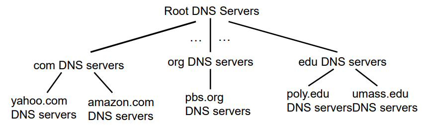 따라서 DNS는 다음과 같이 계층적(hierarchical)이고, 분산된(distributed) 구조로 이루어져 있다.